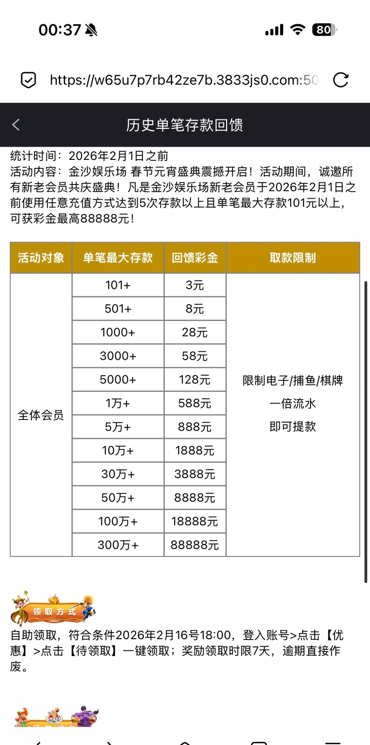 金沙3833今天下午六点领历史单笔存款。明天领历史总投注流水彩金。网址3833.com