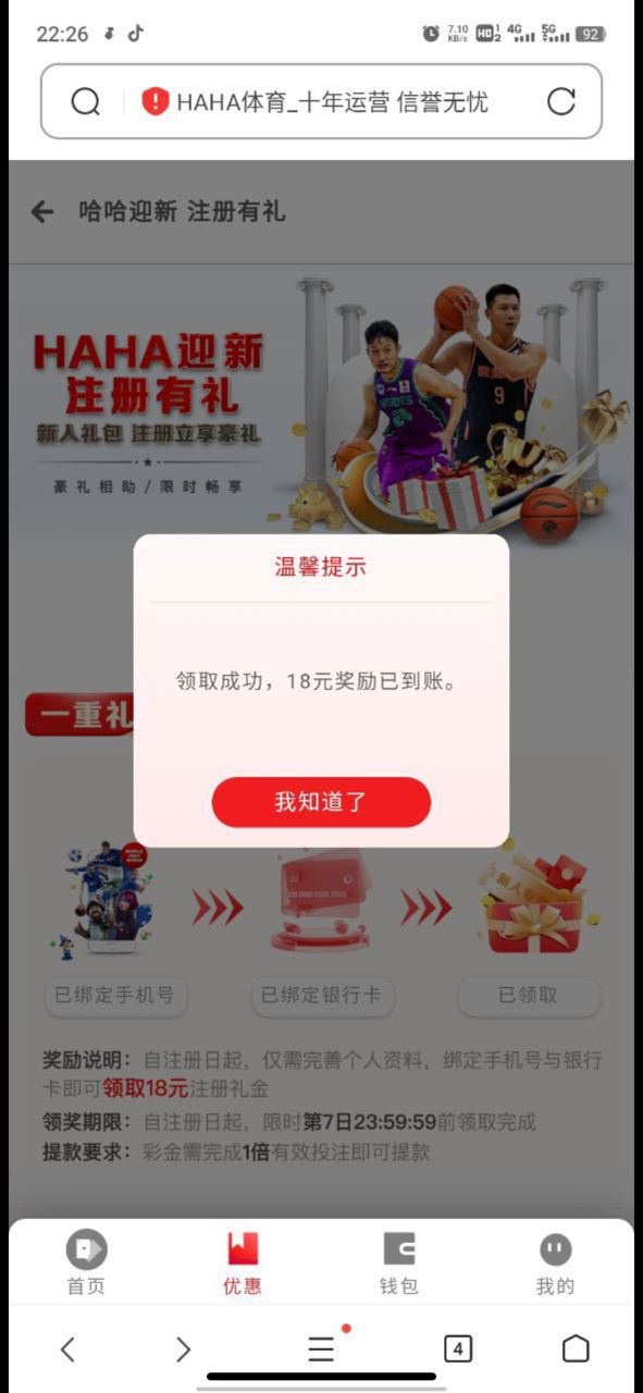 注册绑定手机号和银行卡,优惠里新手任务自助领取18元彩金,最低100提现,具体游戏限制自行询问客服
