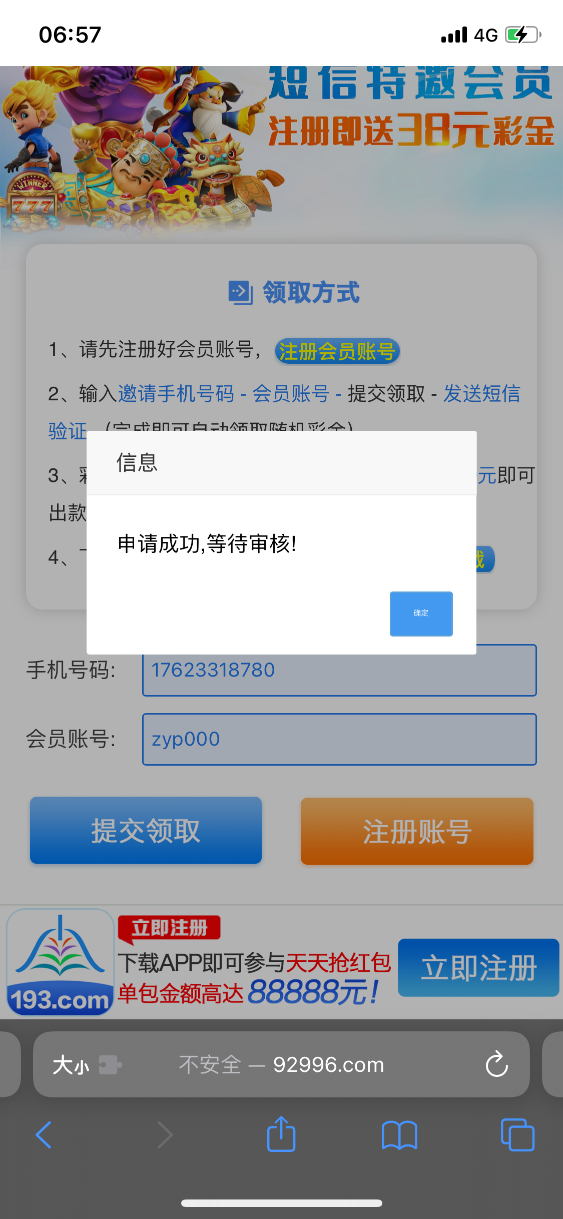 可以先去链接里的自助领取彩金,输入手机号获取验证码,看看能不能收到验证码,能收到说明可以领,之后再注册领取。收不到无视即可。