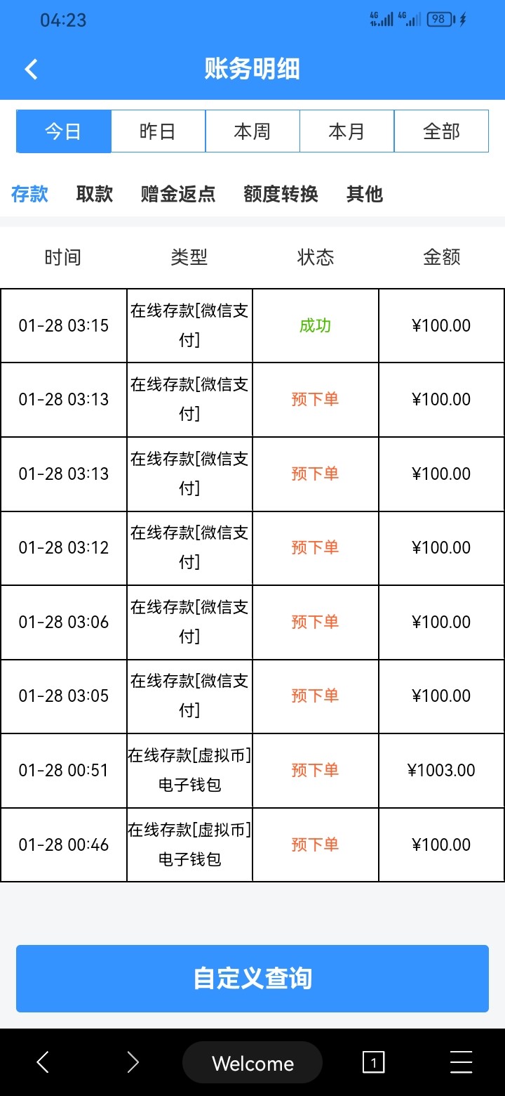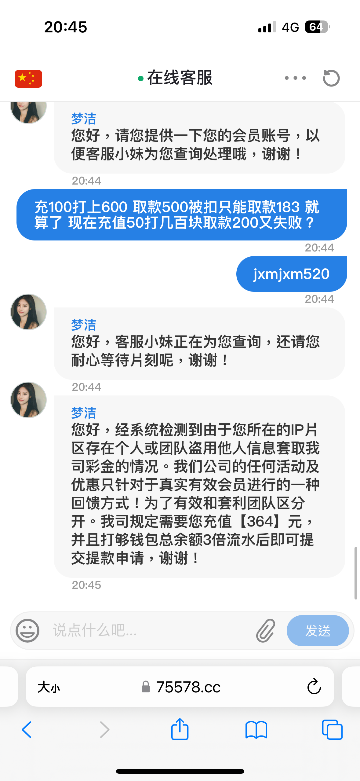 一开始签到几块钱打上去五百左右,然后提现退回,然后说只能出108,剩下人工下掉了,提现过一会又退回,要求充一百,冲完打完流水之后,又变成只能提118,又人工下掉了,一百本金,我打了差不多四个小时,就赢他18块钱,我日他妈妈