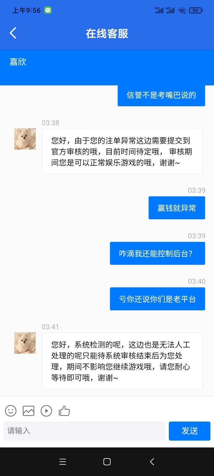 小赢了一两千前面只提现过三次前两次都各种理由卡款……昨日650打到5100申请提现一个小时没动静退回,说网络错误让我重新提交,我重新提交后又退回还莫名其妙多了几块彩金然后流水不够,后面我继续打然后打到6500我又申请提款直接说单注审核,这种小台子真的慎重玩。
