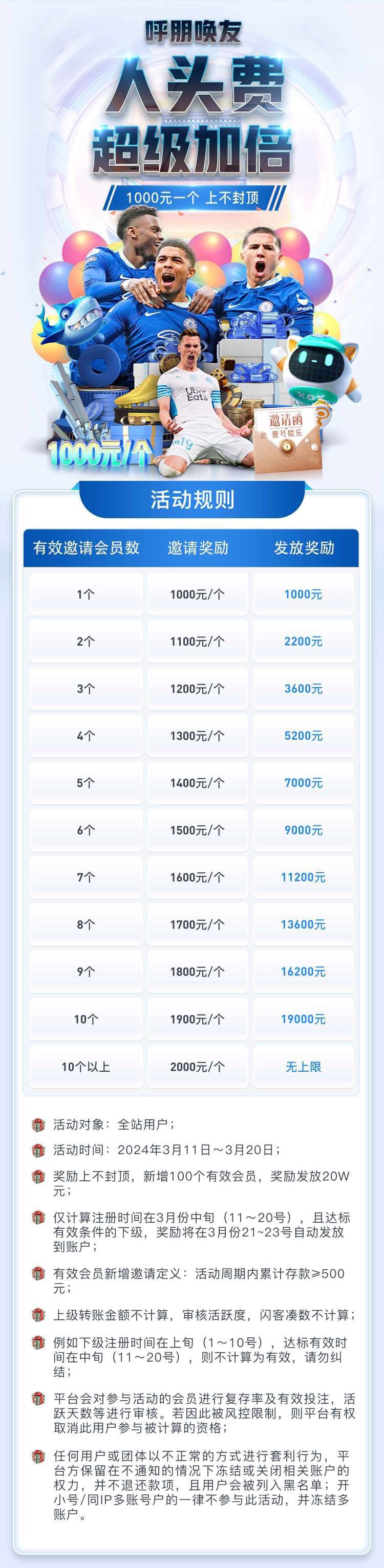 活动期间3月11-3月20日注册达标的用户加倍返利 1000起至2000 10个达标即可领取20000人头费 上不封顶 仅本月中旬一个周期