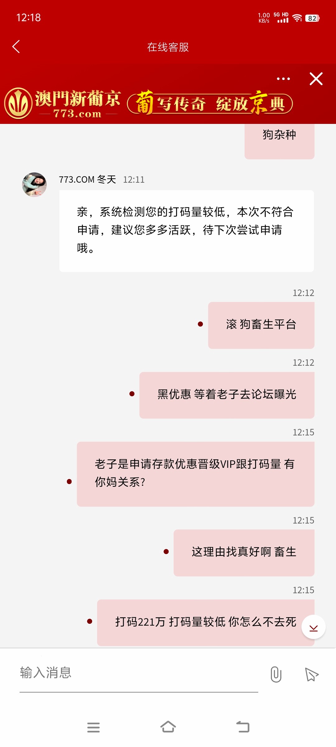 关键是990以前还充值过呢,今年还前段时间还经常玩。就中间隔了有两个来月没玩。今天领了个红包打到400多。罚我三倍打码。把钱给我退回来之后,一个免费也没有。直接就杀光了,唉算了,彻底看透他们的嘴脸了。这段时间不仅亏了几百块钱不说被黑的还不少,要么就是赢了不给出。要么就是发流水。反正就是各种理由不给你。