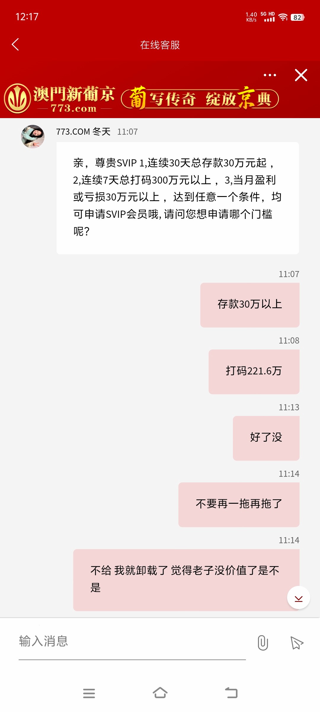 不给就说人家黑,前面赢八万十万时候都想叫773爹了吧