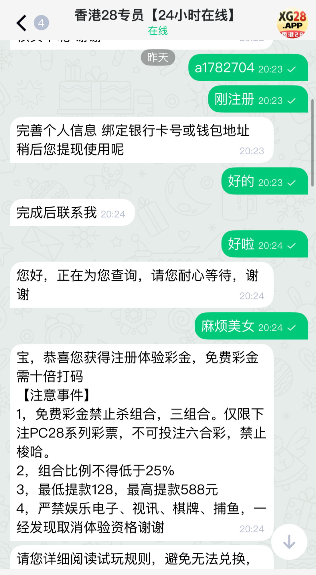 香港28注册送58,注册完绑定出款方式找在线客服说领取注册彩金她会问你哪里来的,就说预测网看到的,然后她会发你一个链接添加专员然后重复上面操作即可,亲测出款300。