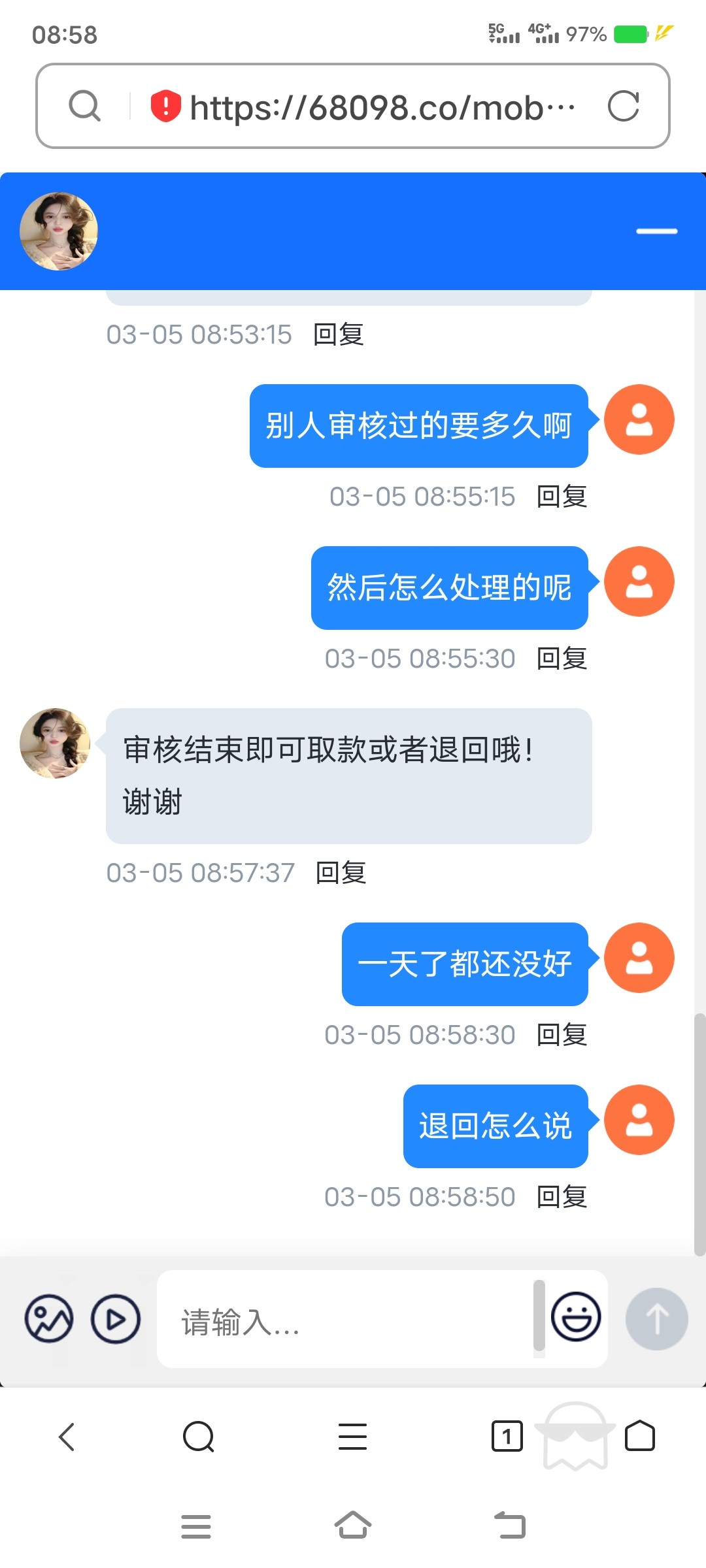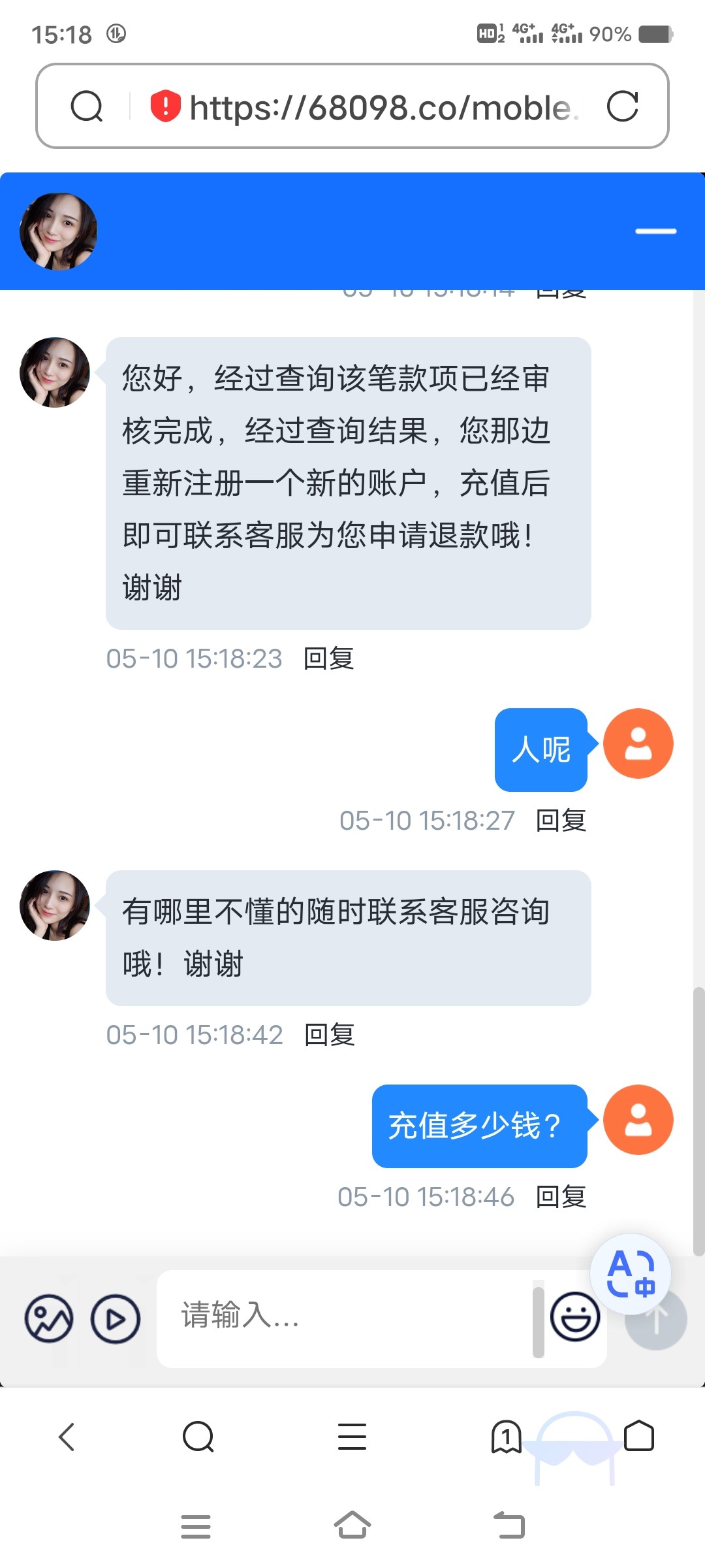 今年2月28号在那个平台上面玩,3月4号提现一万多不出款,说是注单异常需要审核,当时也没太在意,过了一会儿直接账号冻结上不去了。后来直到今天5月10号之前,我一直问客服,客服说在审核,刚刚客服给我说我审核通过了,可以把钱取出来了,他让我重新注册一个账号充钱就可以把钱拿出来,最后我充了一百,没想到我一万多他就退了我一百,他说剩下的要么再充3000退我5000,要么充一万多全额退我,这个一看就是骗钱的,我说算了,好歹还送了一百,锁了一把输了,出来一看流水要1300,我去他妈的,10068.cc这个还有,0098.co是他们平台的网址。