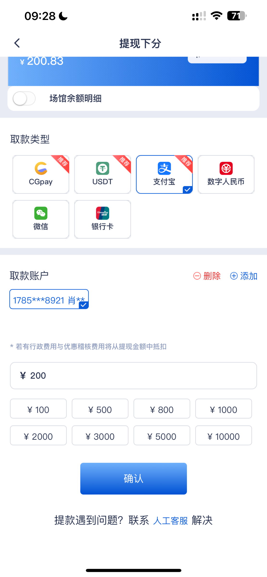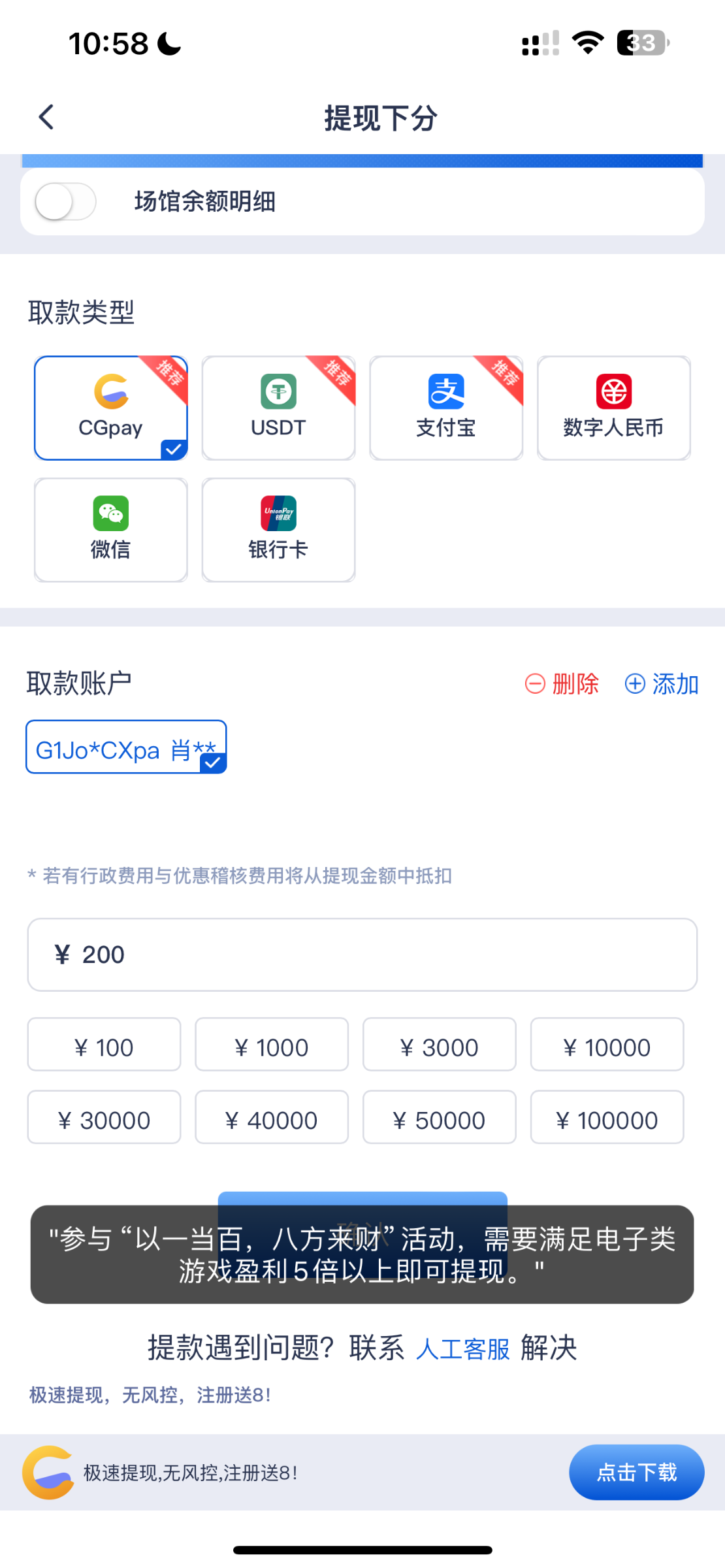 mak 现在提不了咋回事,客服也不回复,你早上送的彩金,他100+100的前天就输完了