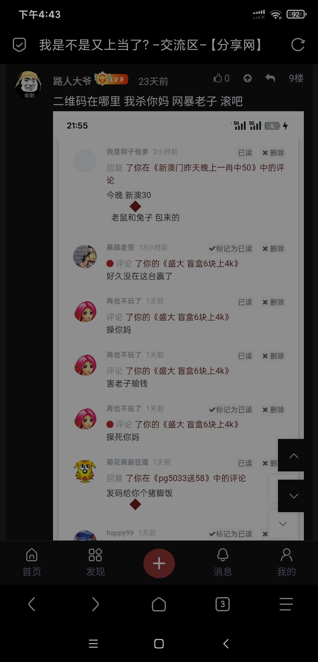 开贴抽20个华子,一个没发,后面又说给猪脚饭,不给然后直接嘴臭骂人。本来逛分享网挺开心的,看到这个人还在跳还在活跃我就很不舒服。这种给人希望又反转是最恶心人的