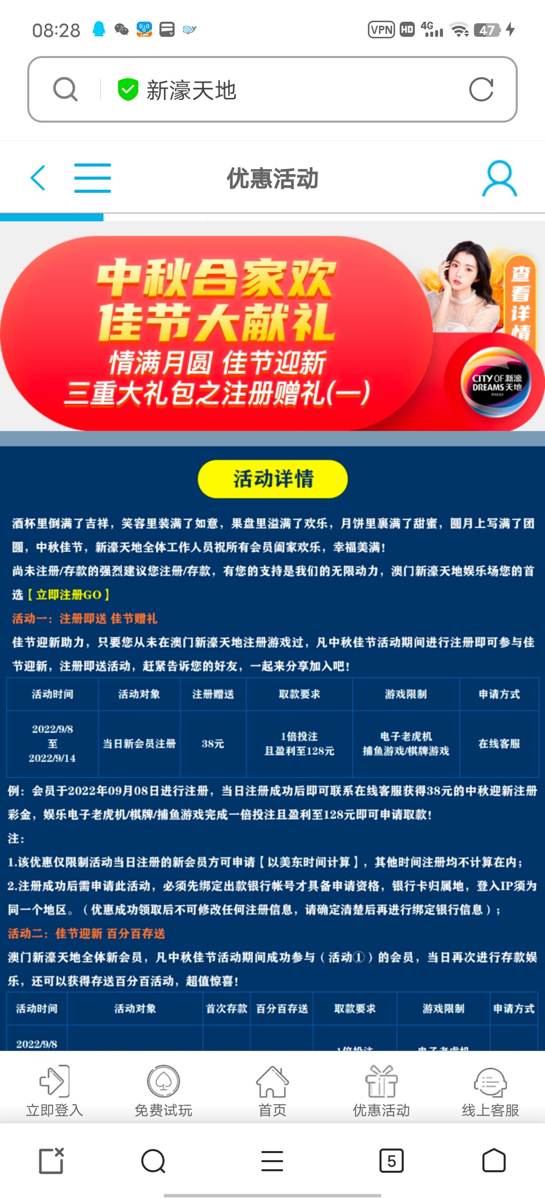 活动:新用户注册绑卡找在线客服申请中秋新人注册彩金,送38具体限制自己问下客服